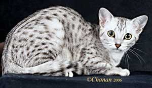 The Egyptian Mau has the distinction of being the only natural spotted breed of domestic cat. An extremely intelligent animal, the Mau places a great importance on family, both human and their own, and is fiercely loyal in his devotion to them. They are moderately active and often express their happiness by chortling in a soft melodious voice and wiggling their tails at great speed while treading with their forepaws.
